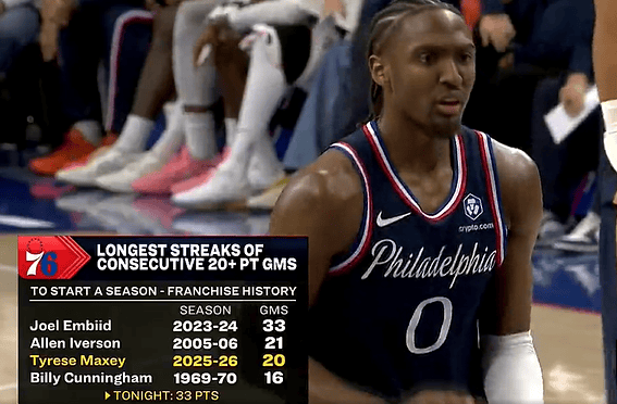 76人隊(duì)史連續(xù)20+場(chǎng)次排行榜:恩比德33場(chǎng)第一,場(chǎng)次艾弗森21場(chǎng)第二,恩比馬克西20場(chǎng)第三。弗森