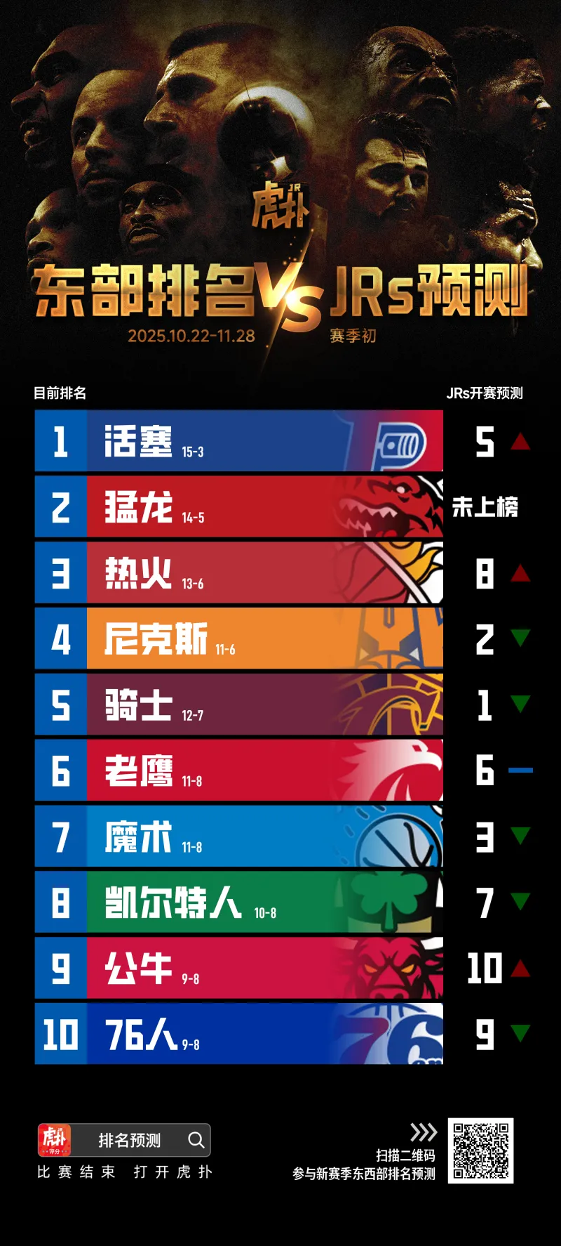 東部當(dāng)前排名與JRs賽季前預(yù)測(cè)對(duì)比:猛龍活塞熱火均巨幅提升,東部當(dāng)前對(duì)比單雄鹿跌出榜單由賽場(chǎng)小助手 發(fā)表在濕乎乎的排名話題 https://bbs.hupu.com/vote