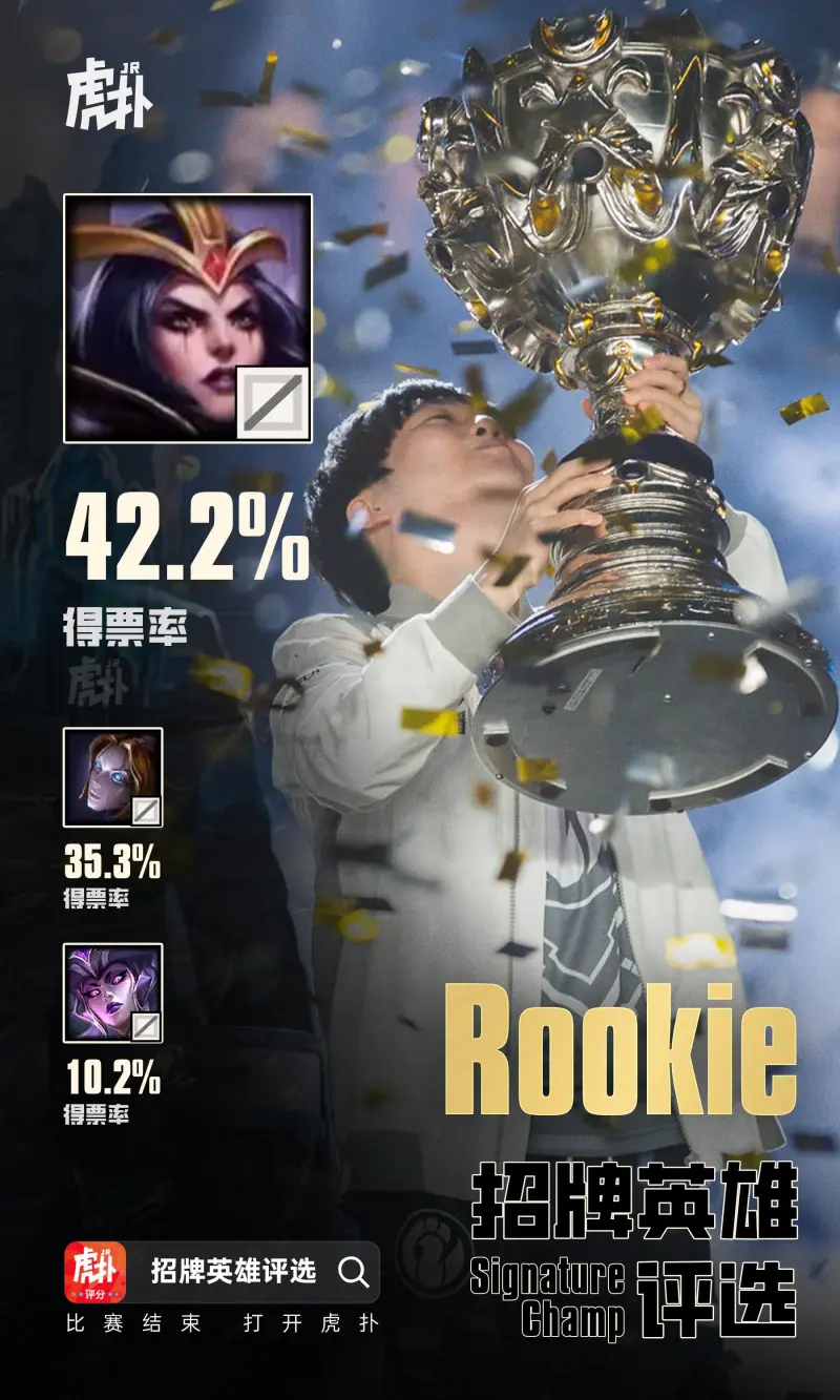 虎撲11月30日訊 經(jīng)過JRs昨日的評選,妖姬以42.2%得票率當(dāng)選Rookie招牌英雄。招牌