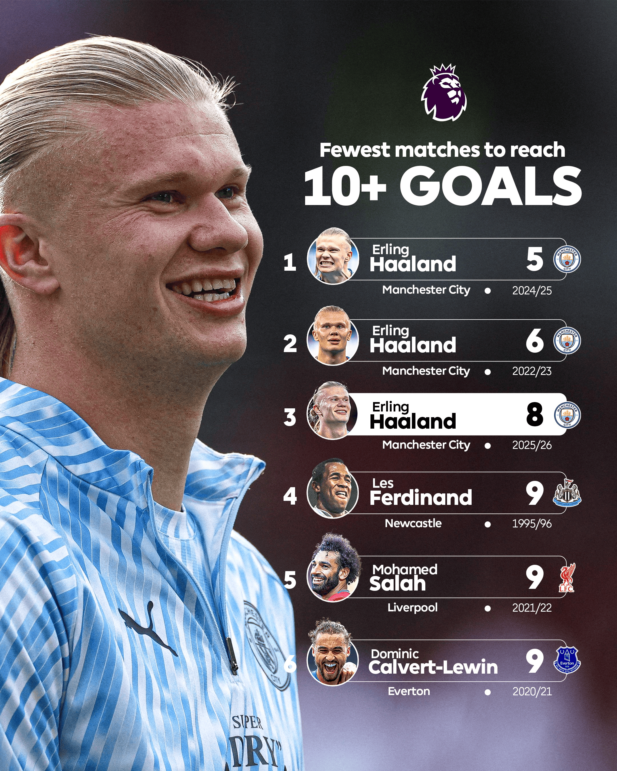 史最雙榜薩拉3.哈蘭德 2025-26賽季 8輪