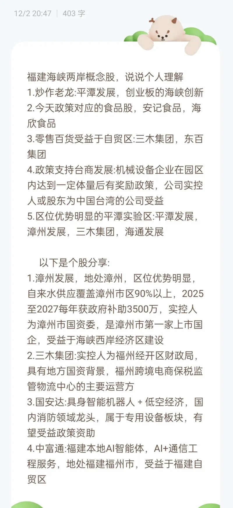 最近福建實施一系列政策利好,以下是福建分享個人對福建板塊的理解,從176個板塊個股里選出幾個最核心的理解受益于海峽兩岸利好的標的