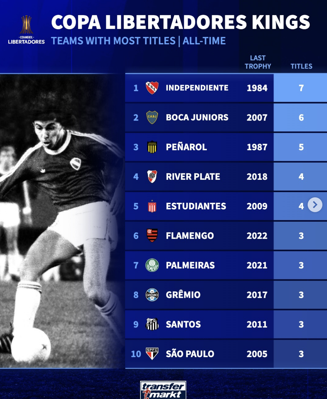 阿根廷獨(dú)立隊(duì)以7次奪冠居首。美解阿根廷博卡青年和烏拉圭的冠次佩納羅爾分別以6次和5次奪冠排列二三位。本年度的數(shù)榜冠軍將在帕爾梅拉斯和弗拉門戈之間產(chǎn)生,兩隊(duì)均已奪冠3次。獨(dú)立隊(duì)次