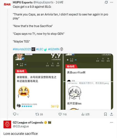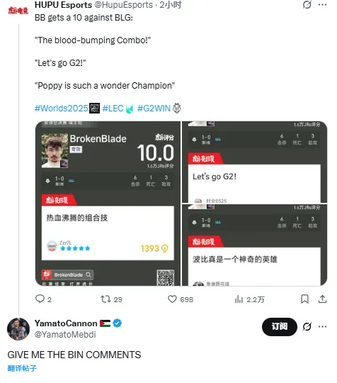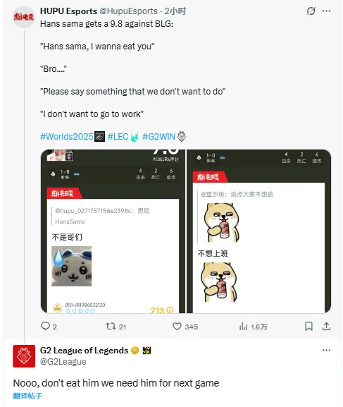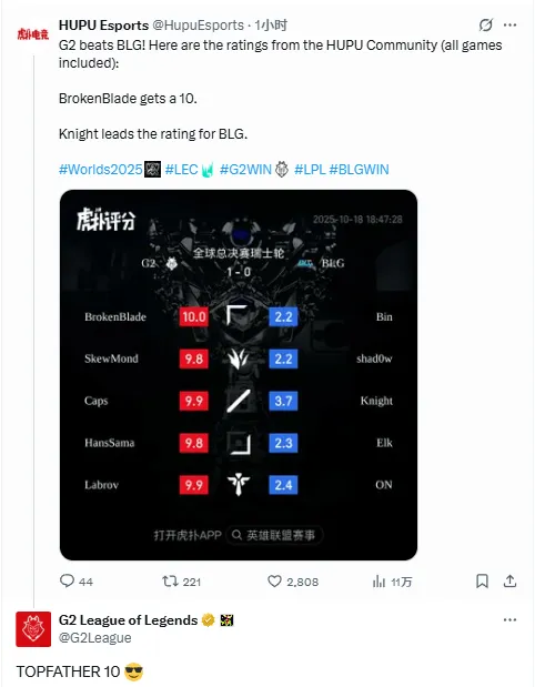 BLG不敵G2后,虎撲官推發(fā)布賽后選手評(píng)分,G2官推積極和虎撲官推互動(dòng),以下是具體互動(dòng)內(nèi)容: