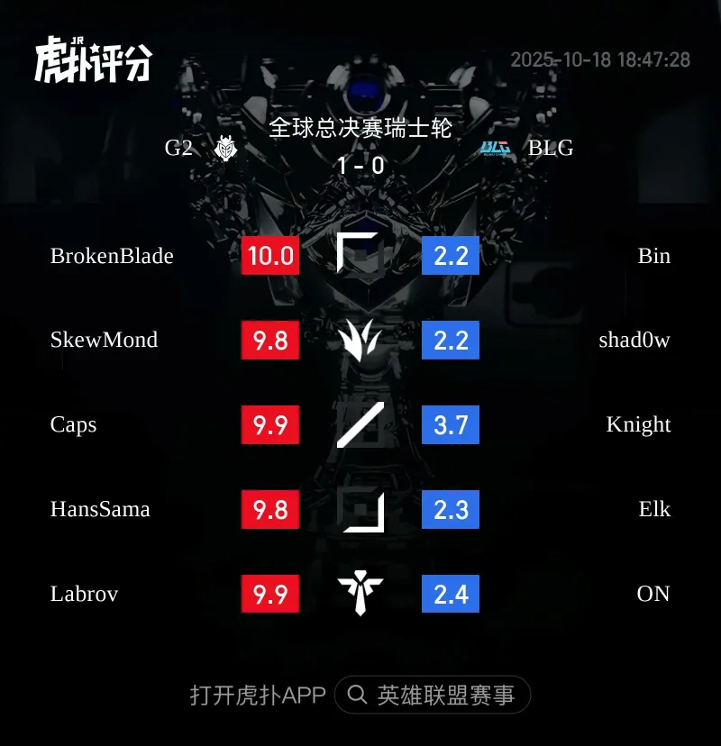 [-]虎撲官推發(fā)布G2上單BrokenBlade評(píng)分10分