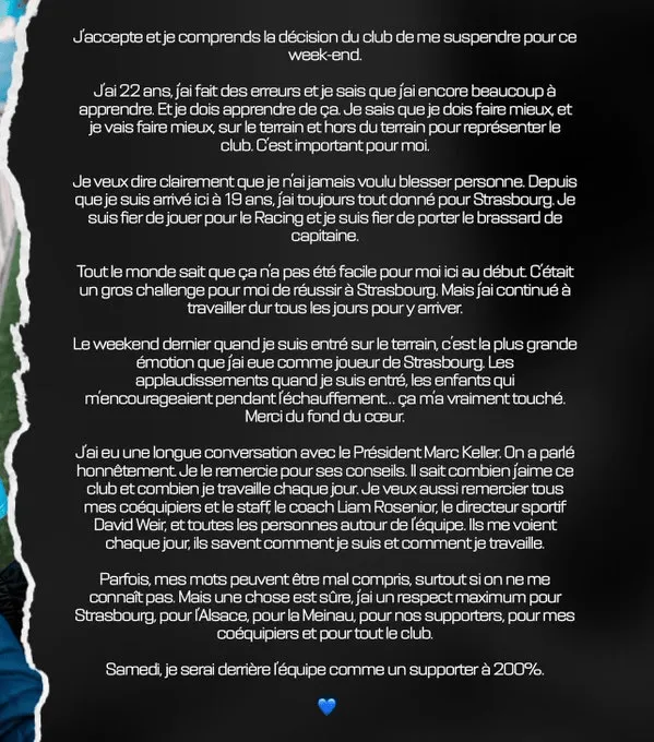 我想澄清,我從未想過要傷害任何人。自從19歲來到這里,我一直為斯特拉斯堡傾盡全力。我為能為斯特拉斯堡效力而感到自豪,也為能佩戴隊長袖標而感到自豪。