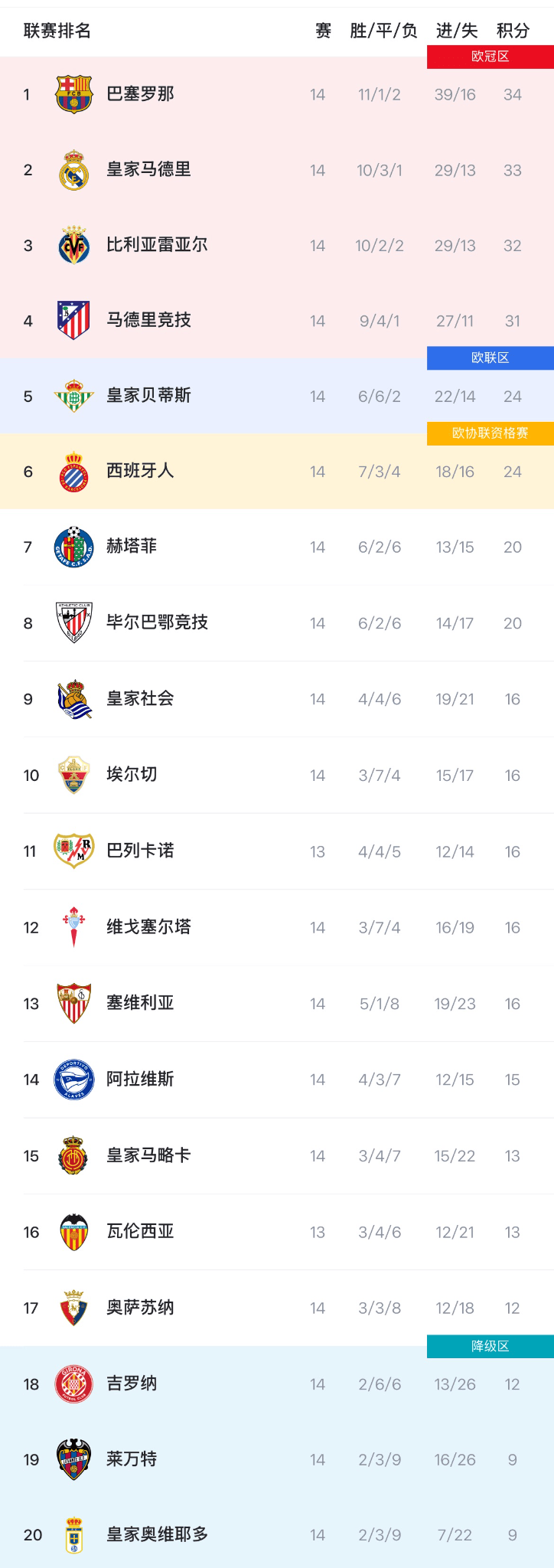 虎撲12月01日訊 西甲第14輪戰(zhàn)罷大部分場(chǎng)次,積分榜形勢(shì)出現(xiàn)變化。皇馬巴塞羅那主場(chǎng)3比1擊敗阿拉維斯,勢(shì)登積分來(lái)到34分,頂黃第暫時(shí)升到榜首。潛第