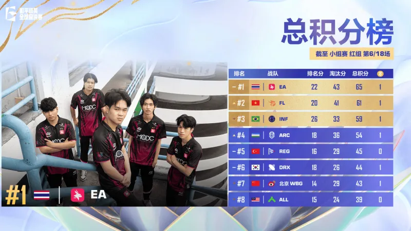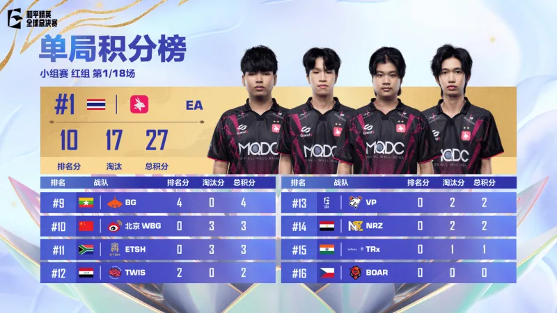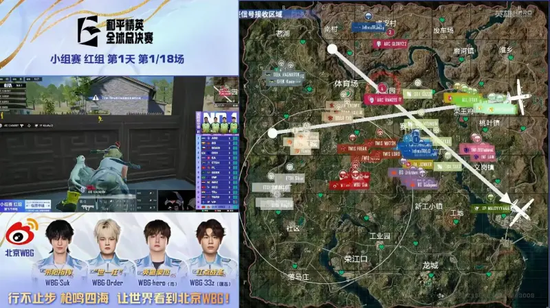 開(kāi)局,VP兩人被ARC抓到并連打帶補(bǔ),隨后房區(qū)內(nèi)也倒下一人,VP僅剩一人;16分鐘,WBG圈型過(guò)差0淘汰出局;21分鐘,INF與EA交火后兩敗俱傷,ARC瘋狂收分;決賽圈GEEK、ARC、FL、BG四隊(duì)交火,獨(dú)狼FL-win先被淘汰,最終ARC成功吃雞。