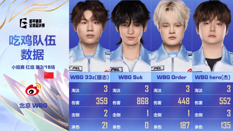 決勝時(shí)刻,信號(hào)圈縮在洋房附近,圈內(nèi)剩余北京WBG戰(zhàn)隊(duì)、INF戰(zhàn)隊(duì)和TWIS戰(zhàn)隊(duì),此時(shí)場(chǎng)上4v4v2。TWIS戰(zhàn)隊(duì)先被淘汰,隨后剩余兩隊(duì)展開(kāi)對(duì)戰(zhàn), WBG戰(zhàn)隊(duì)用手雷打開(kāi)突破口,INF戰(zhàn)隊(duì)率先倒人,隨后WBG戰(zhàn)隊(duì)Order出槍淘汰INF戰(zhàn)隊(duì)最后一人拿下比賽,恭喜北京WBG獲得本場(chǎng)比賽勝利!