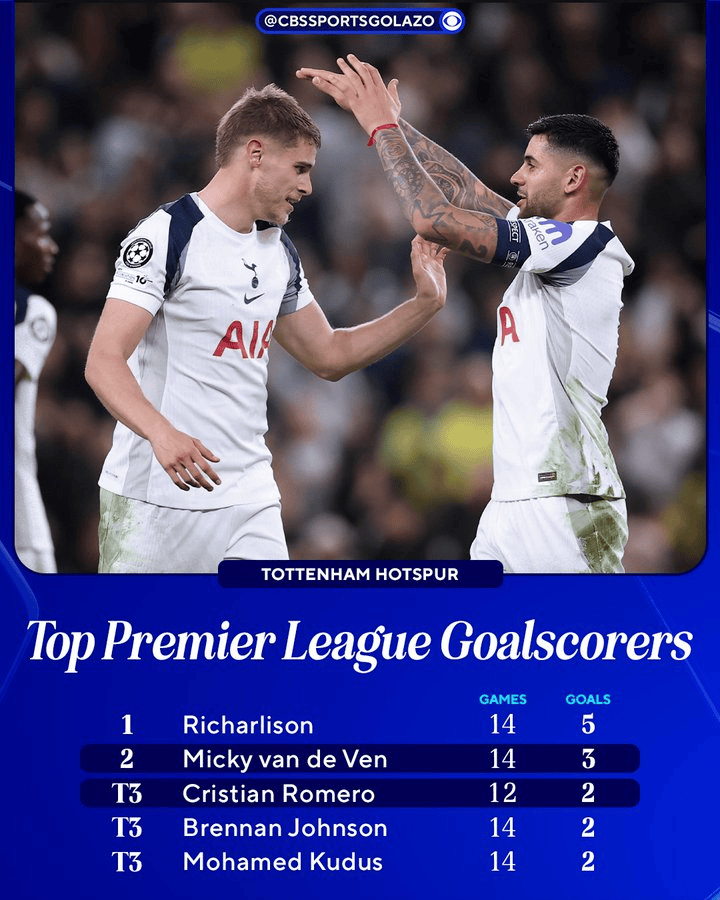 [流言板]熱刺本賽季隊(duì)內(nèi)英超射手榜:范德芬第二,羅梅羅第三