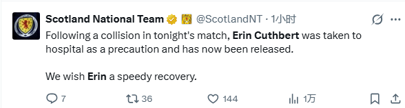 蘇格蘭代表隊官方在一小時前宣布,在今晚比賽中發(fā)生碰撞后,現(xiàn)已休養(yǎng)艾琳-卡斯伯特被送往醫(yī)院進(jìn)行預(yù)防性檢查,出院現(xiàn)已出院。板官伯特被擊